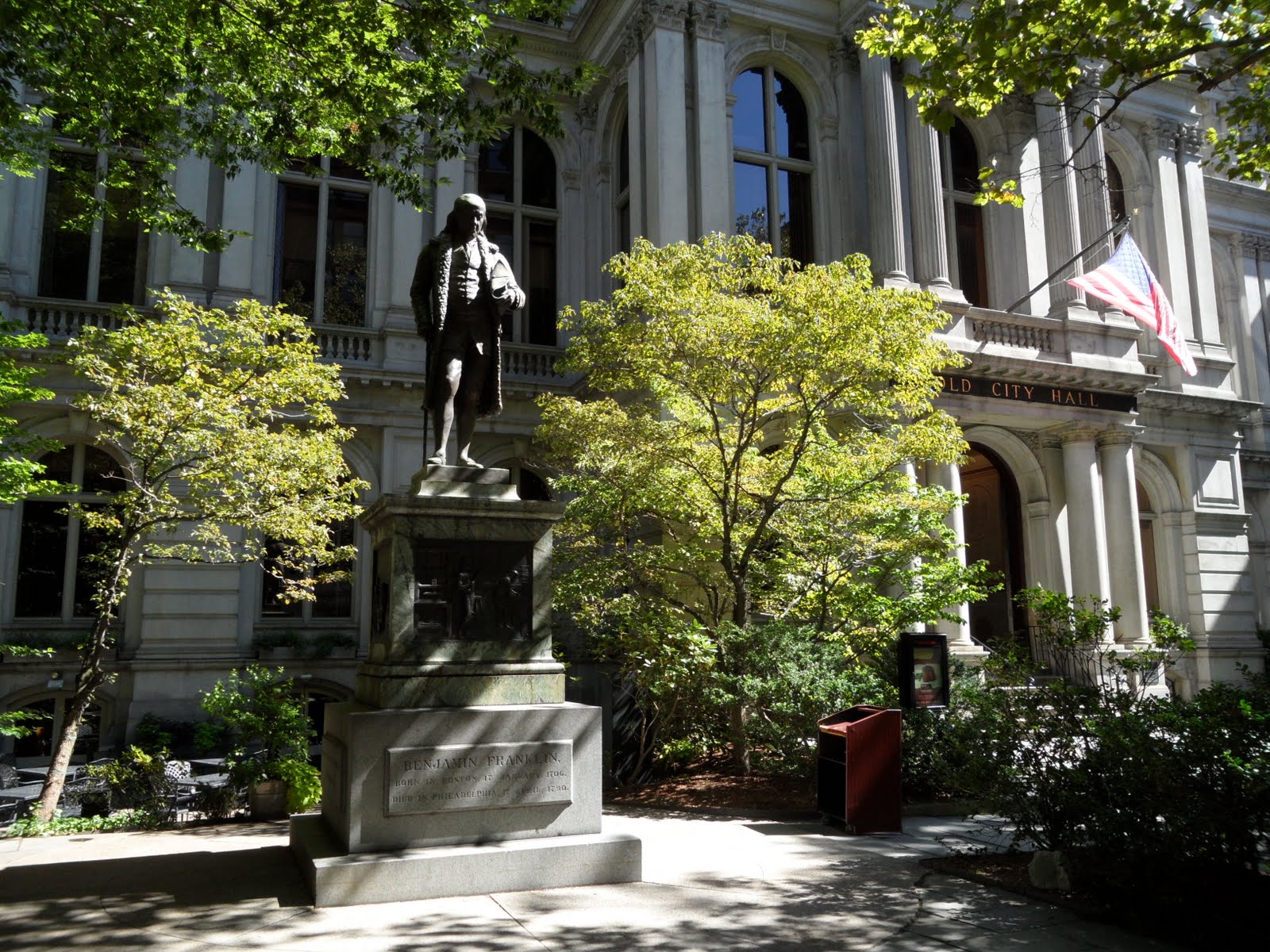 Following the red brick line brought us to King's Chapel, the first Anglican church ordered constructed by King James II of England. Adjacent to the church is the King's Chapel Burying Ground dating back to 1630. The Old City hall is next on the walk, constructed in 1864. In the courtyard is a bronze statue of Benjamin Franklin. The Old Corner Book Store became the literary center of old Boston. Ralph Waldo Emerson, Henry Wadsworth Longfellow, and Harriet Beecher Stowe all gathered there. Diagonally across the street is the Old South Meeting House built in 1729 and home to some heated debates leading to the American Revolution. Following the trail north, one comes to the Old State House, the merchant exchange center of town. Faneuil Hall is next. It witnessed a number of tumultuous debates over Englands constant tax acts on the colonies. The preliminary meetings leading to the Boston Tea Part occurred there.